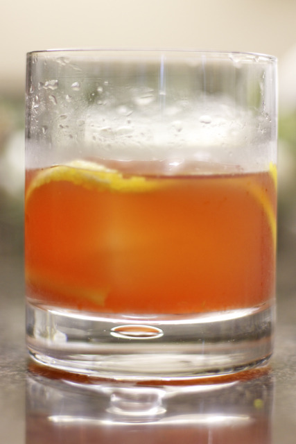 Pour all the ingredients into an old fashioned glass and stir. Add ice and garnish with a lemon peel.